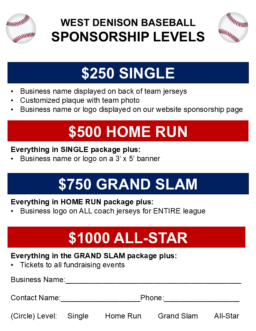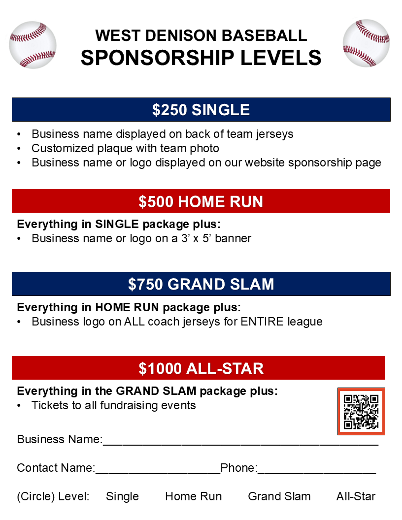 To mail Sponsorship Form and donations via check, please make payable to WEST DENISON BASEBALL and send to:
